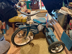 Anvil w/ hardy tool; Victor #8 cast iron waffle maker; cast iron skillets (x3); cast iron griddles (x3); cast iron kettle (on stand, repaired); nice “New Idea” treadle sewing machine; galvanized bucket, tubs; metal lawn chair; old soda bottles; quilts (x7); wood stools; draw knives; brass hand torch; FireKing Jadite platter; kerosene lamps (x2); several Ball green fruit jars; Carnival glass (pitcher, etc); Fenton “Stag and Holly” fluted fruit bowl; wood butter paddle; spoon collection; wood washstand; cast iron “Stagecoach” bookends; Aladdin kerosene lamp (brass); pink depression glass (bowls, platters, sugar-creamer); metal toys; WW2 Navy uniform; handkerchiefs; Eastern Star (10K, yg ring, 25yr pins); costume jewelry (some sterling); Zippo lighters; wristwatches; white metal kitchen cabinet; old marbles (swirl, Benningtons, etc); old Duncan tops (“Kitty Clover”, other); history books (Tina, Livingston Co., Hale, Carroll Co. schools, others); vintage clothing; parlor table; stereoscopes (x2, cards); iron floor lamp; iron bed; 1973 McDonald’s glasses (x10); copper bucket; croquet set; Western Flyer tricycle; “Wonder Horse” rocking horse; 45 records; “Okinawa” souvenir jackets (x2); apple picker; walnut picker; oil can; wooden sleds (x2); hub cap collection; ammo boxes; wagon wheel axle; a large run of antique tools (wrenches, tongs, auger bits, etc.); corn shucker; corn planter; RR padlocks; cow bell; skeleton keys; wooden pulleys (x7); well pulleys (x2); metal planter plates; brass hames; cow kicker; brass cotton scales (x3); tobacco scales; blacksmith tongs (x10+); tractor seat; forge blower; porcelain lights; and other items to be added by sale day. It's impossible to list it all! (Look at the wall photos)