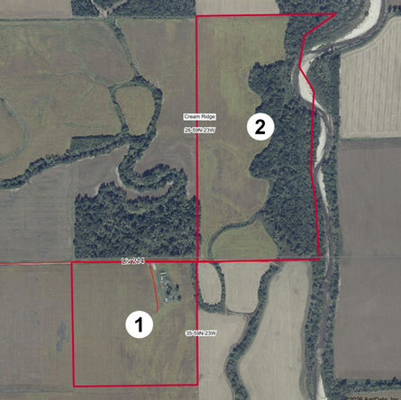 Sale Method: The farms will be sold on a price per acre basis. Tracts 1-2 will be offered through the "Buyers Choice" auction method, whereas the high bidder can purchase, in any order, any or all of the Tracts 1-2 for their high bid. Auctioning will continue in that manner until both tracts have been sold. The tracts will NOT be offered together at the conclusion of the auction. Property will be sold in as-is condition and is not contingent upon buyer's financing, condition of property, appraisal, inspection, or any other contingencies.