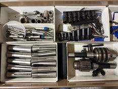 Large run of precision machinist tools including Starrett dial gauges; live center punches; drill bit sets; lathe tool bits; machinist squares; feeler gauges; Grizzly micrometer; dividing calipers; compasses; thread chasing tool; number stamping set (⅛”); letter stamping set; parallel sets (⅛”, ¼”); 12” machine level; industrial drill bits (up to 1-¼”); collettes; milling bits; drill chucks; screw extractor set; counter sink set; Hansen tap-die set; AC R-134 set;